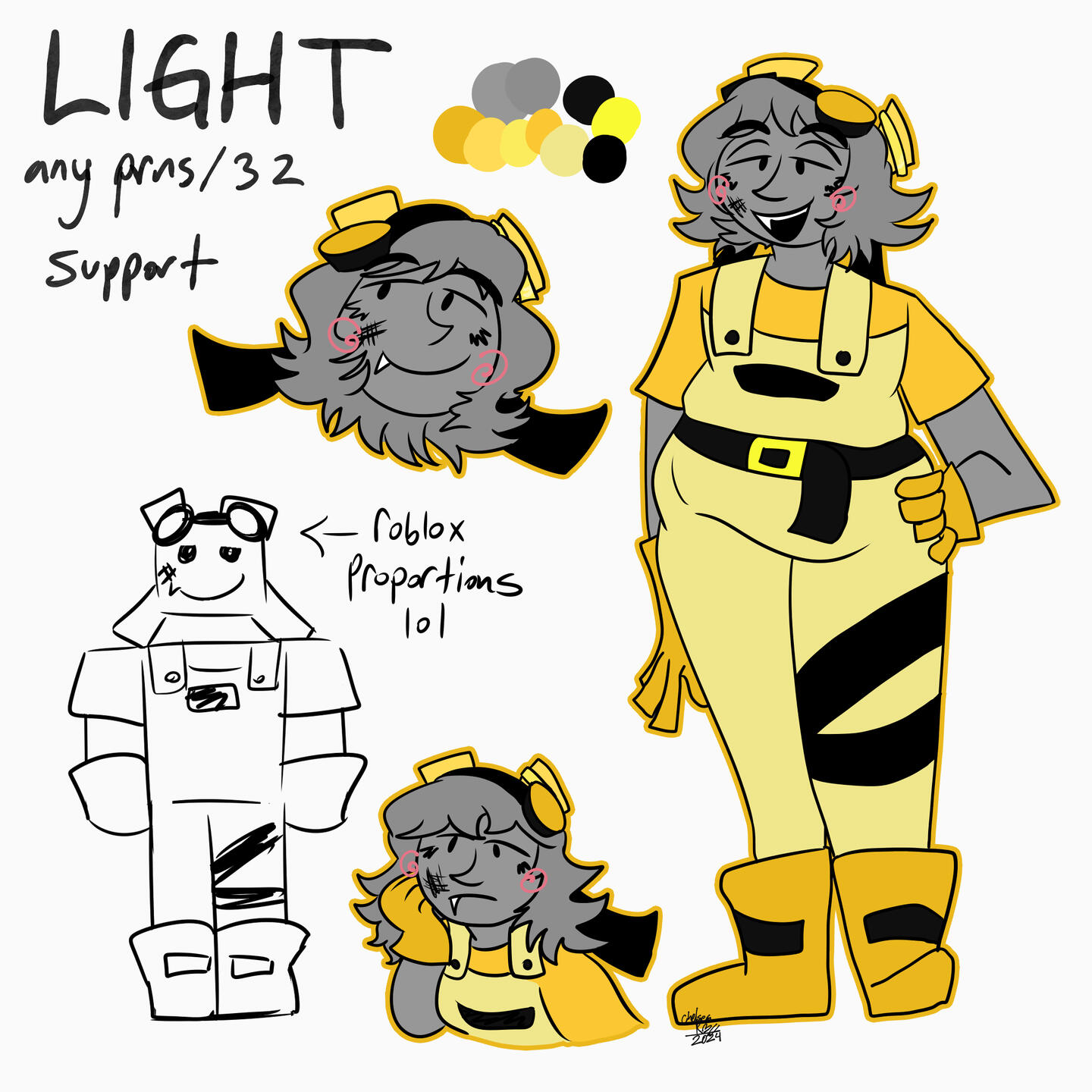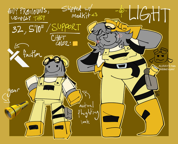light is a modified support gear, uses any pronouns, and is apart of a small organization called the ITR (inpherno technical rescue); imagine the red cross but it's in phighting lol! their team tries to save any inphernal from death, as phighting's world is very dangerous and has a rampant morality rate.